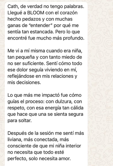 BLOOM puede ayudarte si sientes que estás repitiendo patrones, reaccionando desde la herida o cargando emociones que no sabes cómo sostener. Si sientes que repites patrones, que no tienes tiempo para ti y buscas cultivar una relación amorosa contigo, para liberar, sanar, relacionarte mejor y abrirte a todo lo bueno (el merecimiento, la aceptación, la autenticidad).