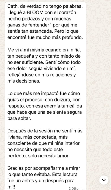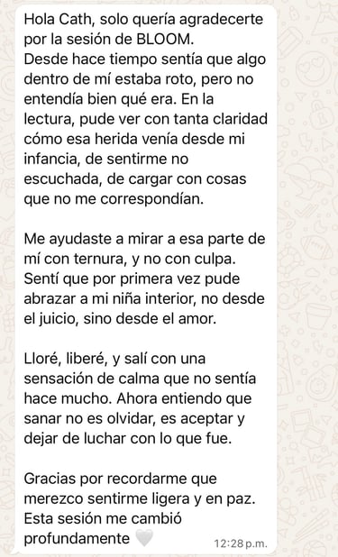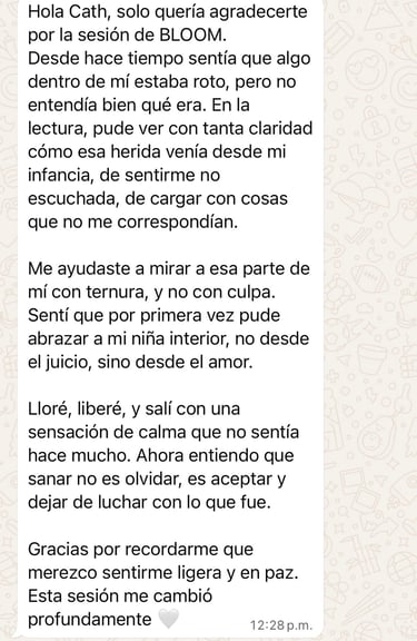 BLOOM es diferente a una lectura normal porque es una lectura/sesión de sanación amorosa enfocada en tu niña interior, donde usamos el tarot y el oráculo como un puente para escuchar lo que esa parte de ti necesita decirte hoy. Miramos con suavidad qué emoción está pidiendo contención, qué herida se está activando y qué patrón se repite para que puedas comprenderte sin juicio. Y, a diferencia de una lectura tradicional donde solo recibes respuestas o mensajes, en BLOOM trabajamos también con una revisión energética (chakras) y cerramos con un ejercicio guiado de integración y liberación, para que tu niña interior no se quede solo “vista”, sino sostenida y acompañada dentro de la sesión.