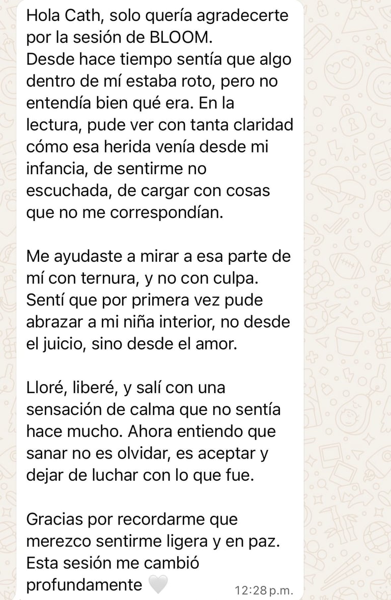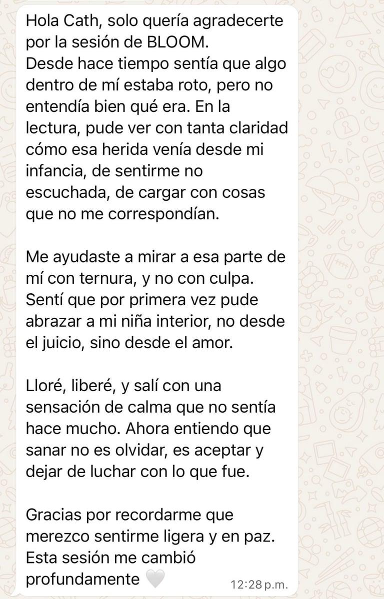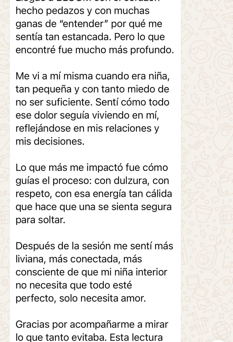 BLOOM es diferente a una lectura normal porque es una lectura/sesión de sanación amorosa enfocada en tu niña interior, donde usamos el tarot y el oráculo como un puente para escuchar lo que esa parte de ti necesita decirte hoy. Miramos con suavidad qué emoción está pidiendo contención, qué herida se está activando y qué patrón se repite para que puedas comprenderte sin juicio. Y, a diferencia de una lectura tradicional donde solo recibes respuestas o mensajes, en BLOOM trabajamos también con una revisión energética (chakras) y cerramos con un ejercicio guiado de integración y liberación, para que tu niña interior no se quede solo “vista”, sino sostenida y acompañada dentro de la sesión.